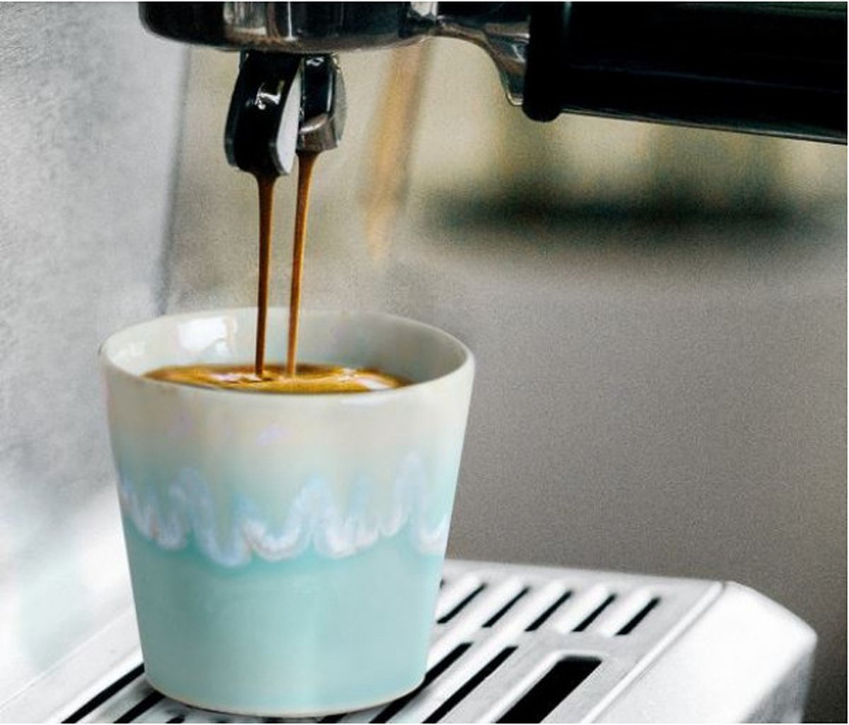 Costa Nova – servies – espresso kop – Grespresso azur – aardewerk – set van 6 Superstoer en robuust servies van het merk Costa Nova. Het aardewerk van Costa Nova wordt in de oven gebakken op extreem hoge temperaturen. Het geglazuurde oppervlak wordt hierdoor veel harder dan gewoon aardewerk. Het materiaal is niet poreus en is heel goed bestand tegen mechanische en thermische schokken. Het kan zonder probleem in oven, magnetron, diepvries en vaatwas gebruikt worden. De productie is nog gedeeltelijk ambachtelijk en elk stuk is uniek. Afmeting: 6,7 x 6,7 cm (B x D)Hoogte in cm: 5,9