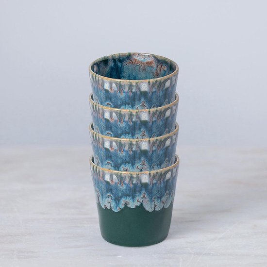Costa Nova – servies – espresso kop – Grespresso azur – aardewerk – set van 6 Superstoer en robuust servies van het merk Costa Nova. Het aardewerk van Costa Nova wordt in de oven gebakken op extreem hoge temperaturen. Het geglazuurde oppervlak wordt hierdoor veel harder dan gewoon aardewerk. Het materiaal is niet poreus en is heel goed bestand tegen mechanische en thermische schokken. Het kan zonder probleem in oven, magnetron, diepvries en vaatwas gebruikt worden. De productie is nog gedeeltelijk ambachtelijk en elk stuk is uniek. Afmeting: 6,7 x 6,7 cm (B x D)Hoogte in cm: 5,9