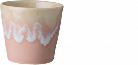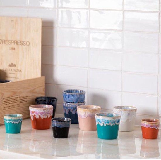 Costa Nova – servies – espresso kop – Grespresso azur – aardewerk – set van 6 Superstoer en robuust servies van het merk Costa Nova. Het aardewerk van Costa Nova wordt in de oven gebakken op extreem hoge temperaturen. Het geglazuurde oppervlak wordt hierdoor veel harder dan gewoon aardewerk. Het materiaal is niet poreus en is heel goed bestand tegen mechanische en thermische schokken. Het kan zonder probleem in oven, magnetron, diepvries en vaatwas gebruikt worden. De productie is nog gedeeltelijk ambachtelijk en elk stuk is uniek. Afmeting: 6,7 x 6,7 cm (B x D)Hoogte in cm: 5,9