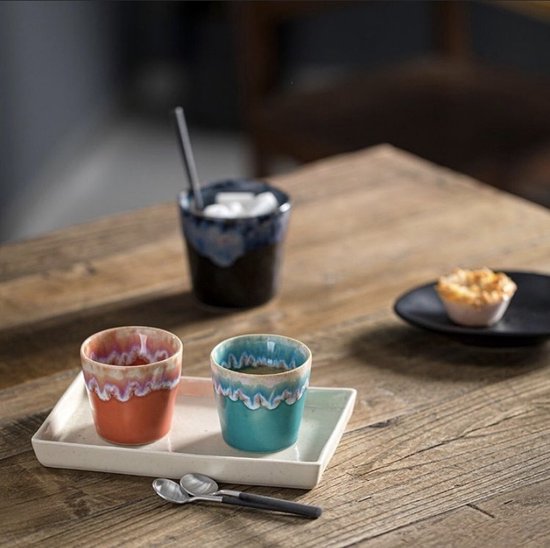 Costa Nova – servies – espresso kop – Grespresso azur – aardewerk – set van 6 Superstoer en robuust servies van het merk Costa Nova. Het aardewerk van Costa Nova wordt in de oven gebakken op extreem hoge temperaturen. Het geglazuurde oppervlak wordt hierdoor veel harder dan gewoon aardewerk. Het materiaal is niet poreus en is heel goed bestand tegen mechanische en thermische schokken. Het kan zonder probleem in oven, magnetron, diepvries en vaatwas gebruikt worden. De productie is nog gedeeltelijk ambachtelijk en elk stuk is uniek. Afmeting: 6,7 x 6,7 cm (B x D)Hoogte in cm: 5,9
