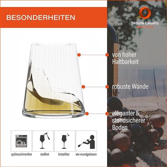 • Details: de praktische Stölzle wittewijnglazen met verticale texturen aan de binnenkant hebben een volume van 380 ml (vol rand), zijn 101 mm hoog en staan zeer stabiel.